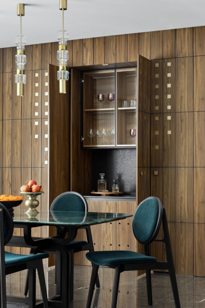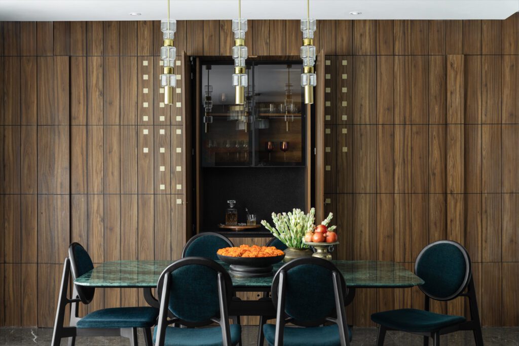 Across the room, an origami-inspired partition conceals a serene prayer nook, its pristine whites glowing against accents of wood and brass, materials that reappear as quiet leitmotifs throughout the home. The dining zone, meanwhile, blurs the boundary between restraint and richness. A walnut-paneled wall conceals five doors in seamless symmetry, while brass inlays reinterpret the Toran, the ceremonial hanging seen in Indian homes. Overhead, three luminous brass-and-glass pendants take their cue from temple bells, echoing softly against a bespoke Udaipur green marble table and ceramic lotus installations by Priya Sundaravalli Sudharsan of Auroville.