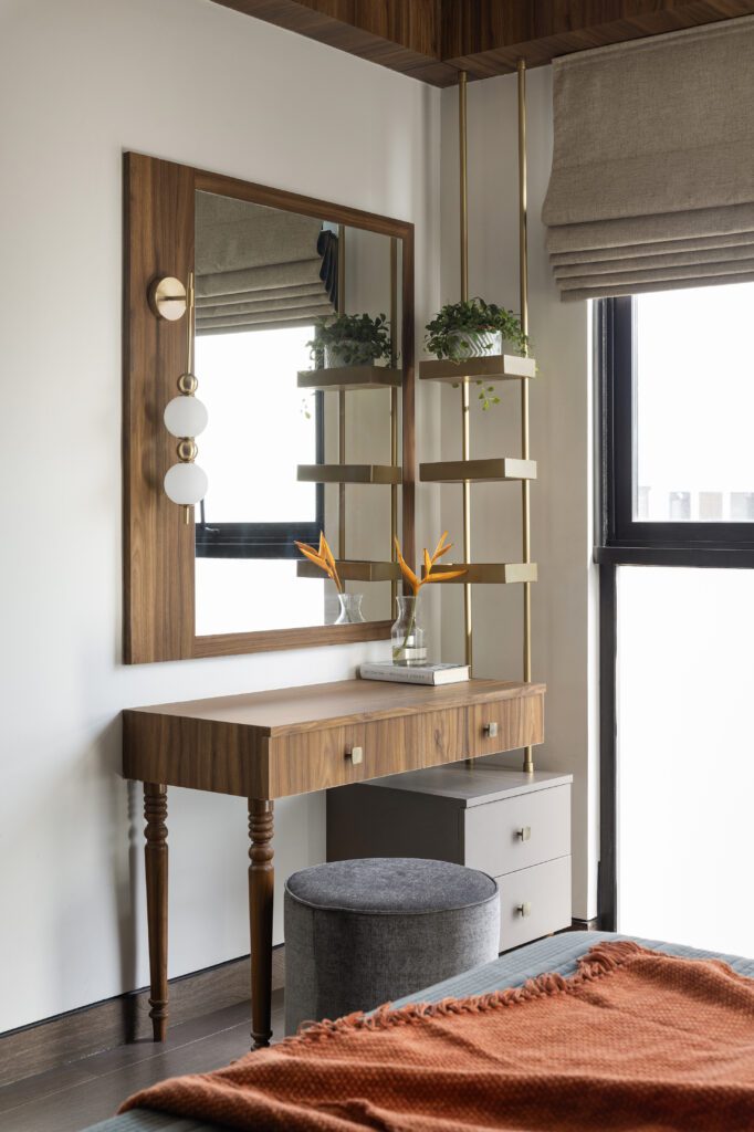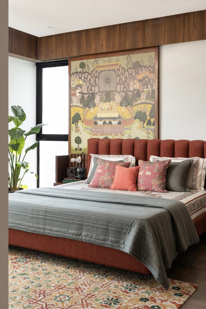 The master suite, however, is where Nesavu’s spirit reaches its crescendo. An all-white shell punctuated with rust, umber, and sage green becomes the canvas for a bespoke Pichwai mural, scaled from a miniature Jodhpur painting and mounted on a sliding panel. “It allows the couple to modulate light while bringing art into the rhythm of everyday living,” Ashwath explains. The tufted rust headboard, slatted wood backdrop, and bespoke vanity in wood and brass embody timeless craft and quiet luxury.