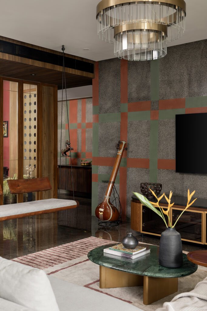 Before one even steps inside, Nesavu begins to narrate. The foyer’s Kota flooring, accentuated by Jaisalmer inlays, forms a delicate kolam motif, an homage to South Indian courtyards. Udaipur green marble, veined and sinuous, winds through the entryway inlaid with brass and natural stone geometries. A tactile detail appears on the wall: slender brass rods project from a wooden panel to hold woven baskets, a poetic nod to the morning rituals of milk and newspaper deliveries.
