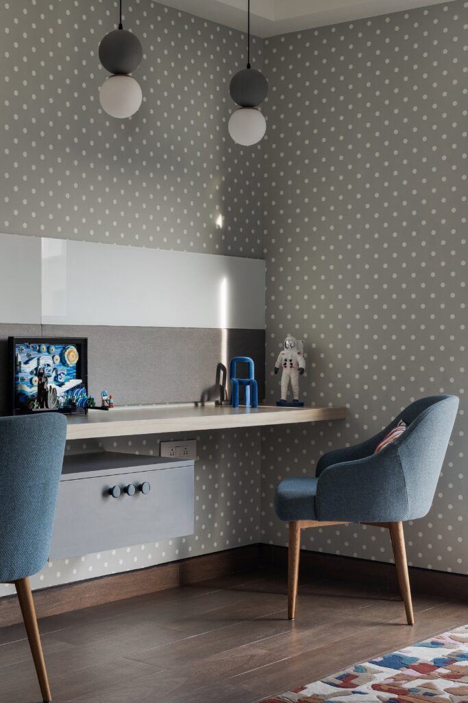 The guest bedroom celebrates memory and heirloom: an antique family bed, gingham upholstery, and Ikat-patterned wardrobes blend warmth with nostalgia. The child’s bedroom bursts into Prussian blue, a space designed to grow with its young inhabitant, featuring a custom bunk bed, a turned-leg study desk, and a window seat for slow reading days.