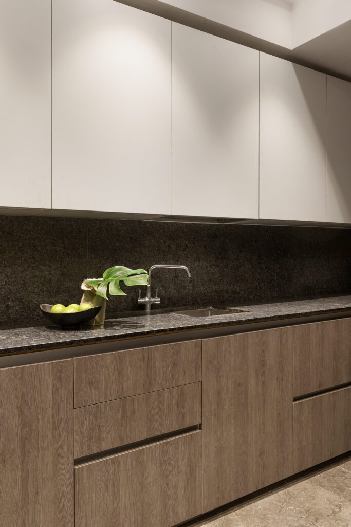 In contrast, the kitchen adopts a serene, functional persona, white lacquered cabinetry, steel-grey granite counters, and oak-toned millwork define its quiet minimalism.
