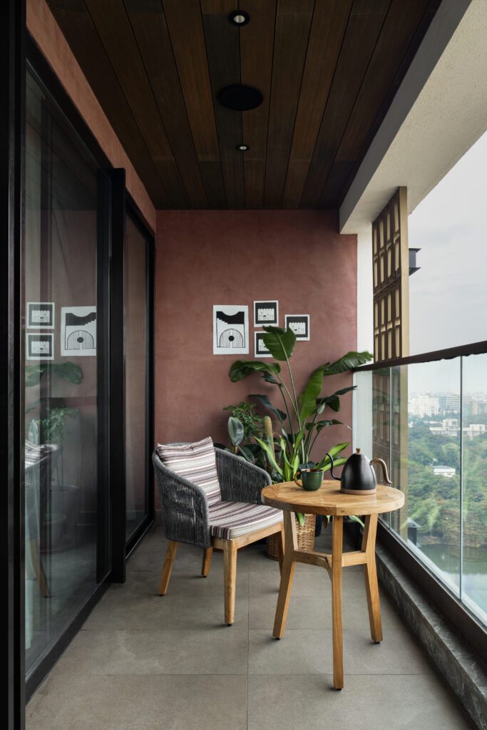 From the balcony, views of bobbing boats and rippling greens along the Adyar River unfold. Terracotta stucco walls and teak ceilings merge the indoors with the outdoors, complemented by furniture from Signature Studio and art from Inc Sanctum, a curation that invites lingering afternoons and introspective sunsets.