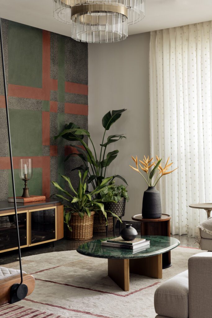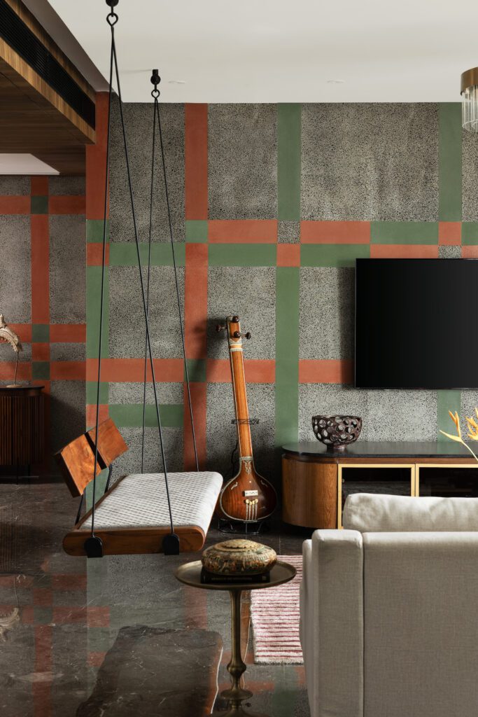 Inside, the palette blooms. Walls drenched in oxide hues of emerald and rust, flecked with chips of grey terrazzo, create a vivid backdrop reminiscent of handloom threads crossing on a loom. “Terrazzo is rarely seen on walls, we had to reinvent its application,” Divya explains. “We wanted the texture to invite touch, to age gracefully, and to tell its own story over time.”