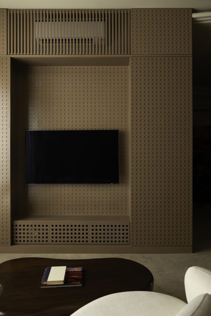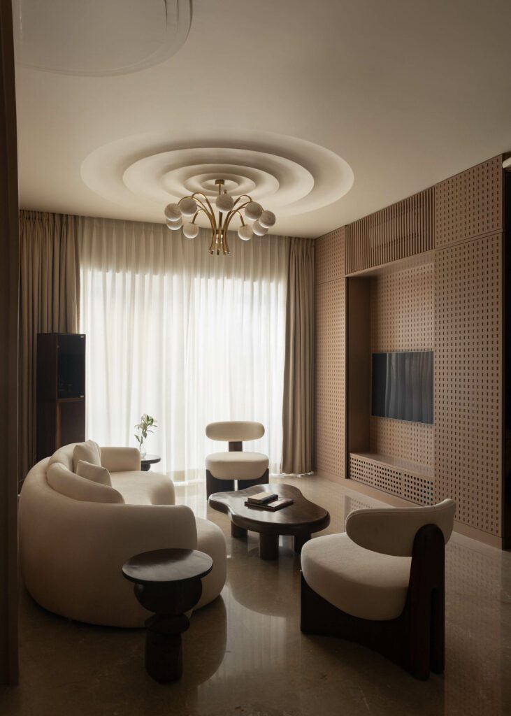 The signature of Aria lies in its softened architectural language. Studio Homzstead intentionally responded to the rigidity of typical urban apartments by introducing curves and tactile elements that create a sense of gentle motion. From ceiling profiles to furniture forms, each detail reinforces continuity. Materials and colours have been chosen for their ability to evoke depth without visual noise, creating an environment that feels grounded and harmonious.