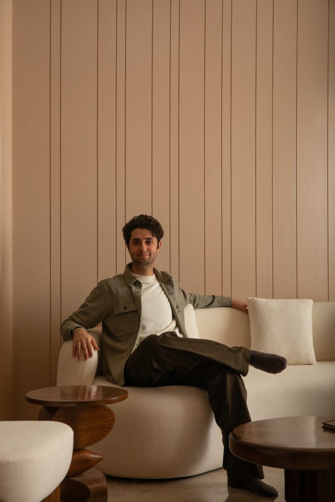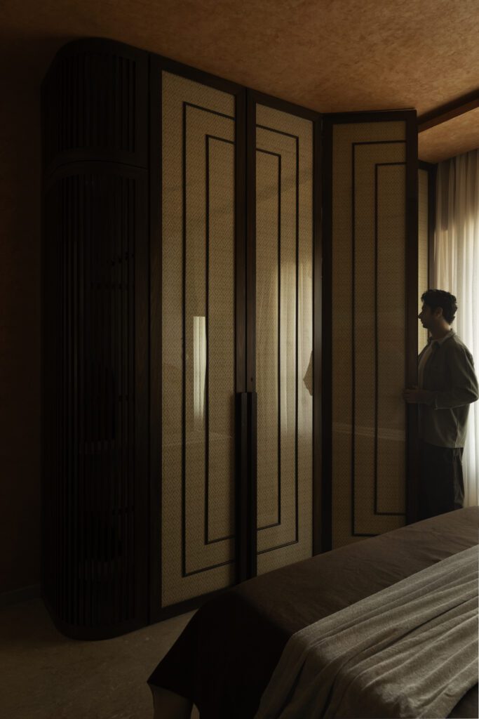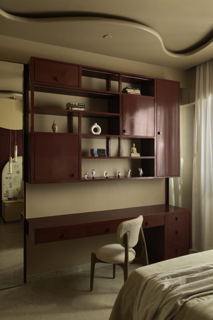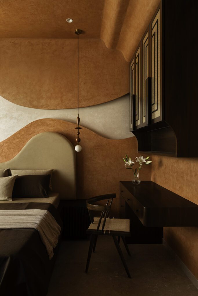 This bedroom carries a bold yet immersive personality through its terracotta drenched envelope. Curved ceiling and wall panels transform the room into a warm, sculptural cocoon. Textured surfaces introduce tactile richness, while dark wood details in the desk and wardrobe bring sophistication and balance. The room reflects a youthful energy without compromising on refinement, combining global influences with a sense of grounded warmth.