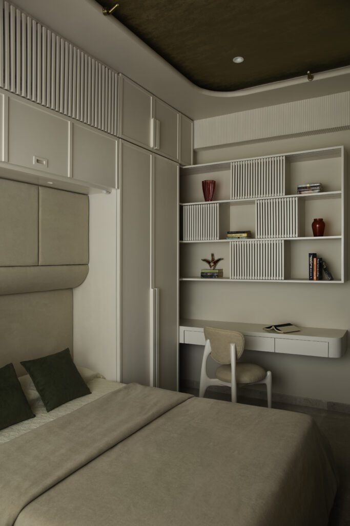 The master bedroom shifts into a calming, cocoon like palette where soft burgundy meets warm neutrals. The custom designed bed, featuring a fluted headboard, offers an immediate sense of repose. Asian print textured wallpaper becomes a key element, adding depth and tactility while maintaining understated elegance. Subtle lighting and gentle contours complete the ambience, creating a restful yet elevated environment designed for long term comfort.
