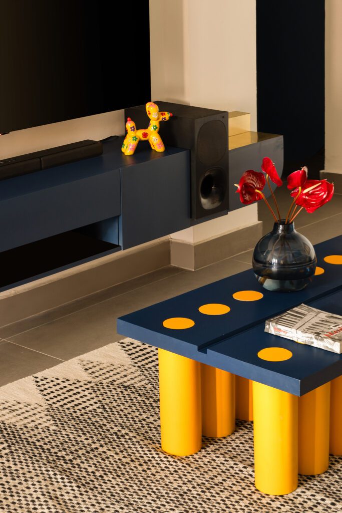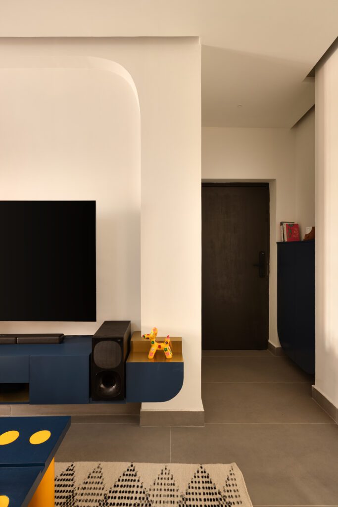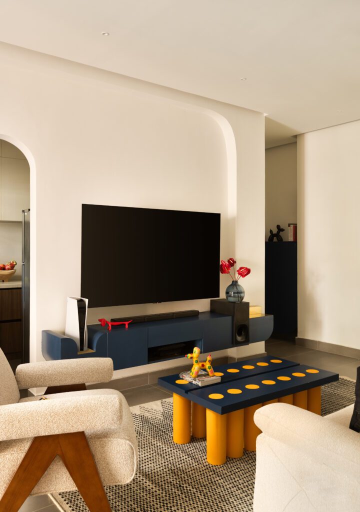 At the heart of the living space is a striking sculptural TV unit that exemplifies the studio’s approach. Conceived as more than a storage or display element, it functions as a piece of functional art. The form is carefully shaped around the electronics it houses, including a PS5, woofer system, and media components, integrating them seamlessly into a fluid composition. What is typically hidden or treated as purely utilitarian becomes an expressive architectural gesture, one that anchors the room while reinforcing the home’s playful narrative.