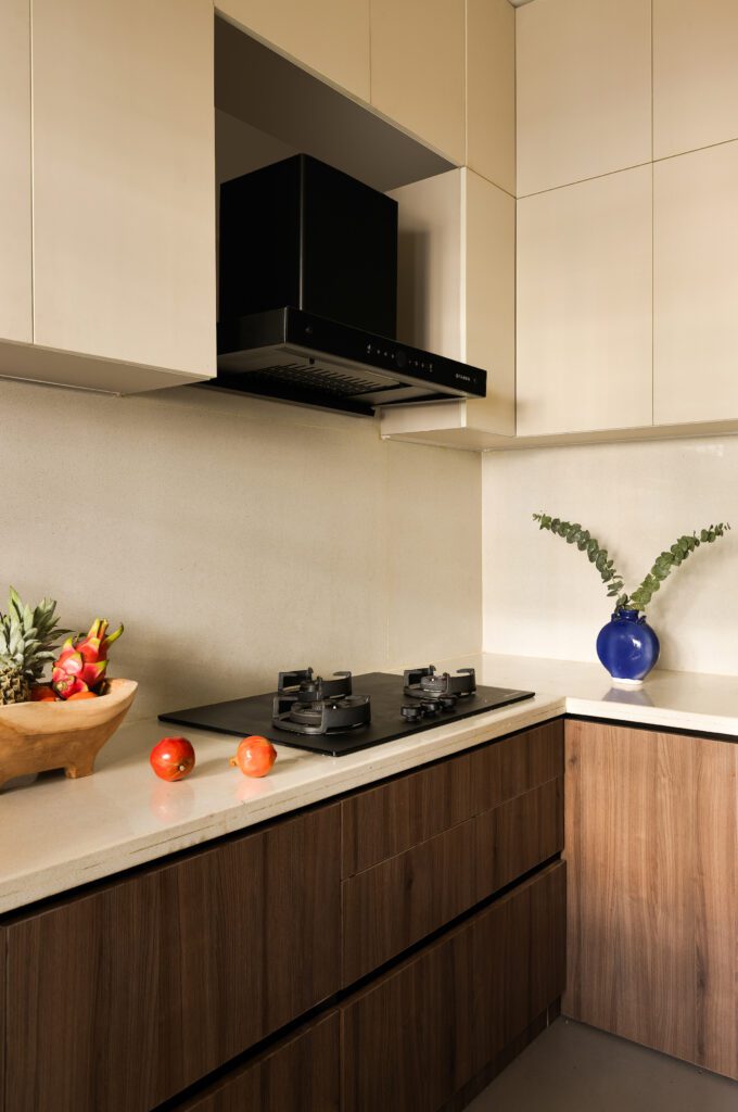 Adding another layer of meaning is the custom-designed coffee table, inspired by the traditional Tamil board game pallankuzhi. Its carved pockets and rhythmic geometry reinterpret nostalgia through a contemporary lens, creating a tactile object that bridges memory, culture, and modern design. This sensitivity to storytelling runs throughout the apartment. Subtle abstractions inspired by Ionic columns appear in softened flutings and sculptural rhythms, offering a nod to the client’s admiration for Renaissance and Roman architecture. Interwoven with these classical references is an abstracted football field motif, a quiet yet spirited tribute to the client’s love for the sport.