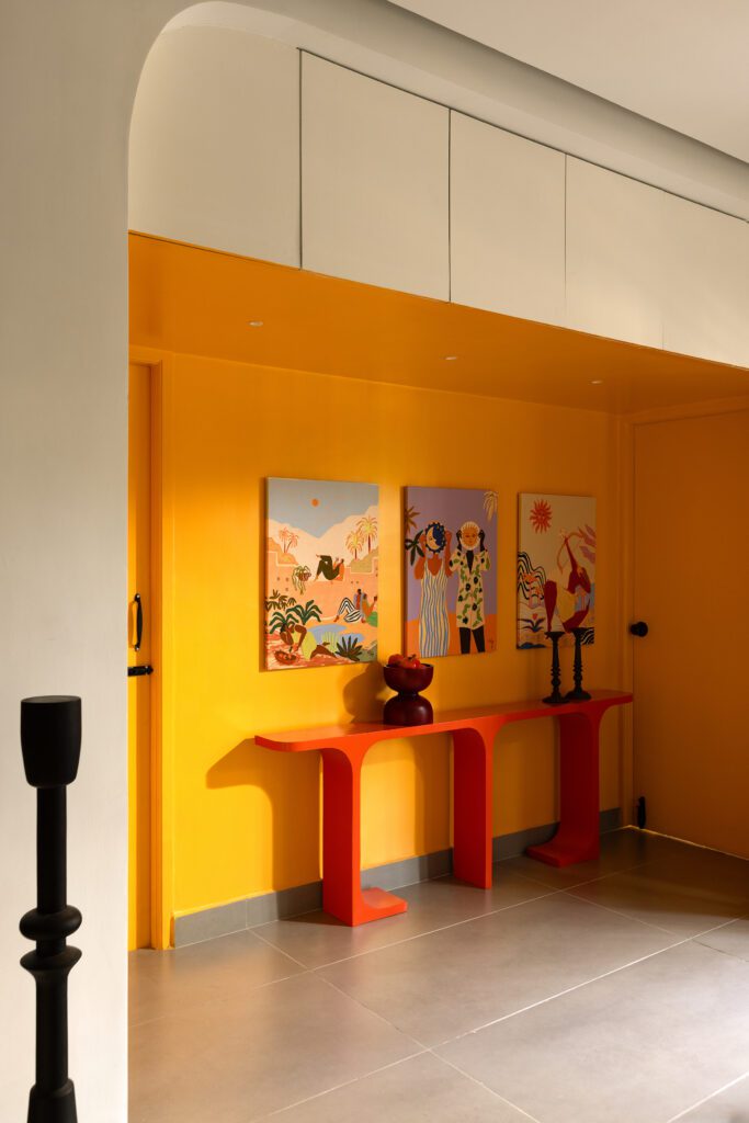 From the entrance itself, the home announces its intent. Color is used with confidence, forms feel sculptural rather than static, and the layout encourages movement and interaction. The atmosphere is warm and inviting, yet edged with a certain boldness, an interior that feels lived-in but never predictable. Rather than following a singular stylistic template, the design thrives on thoughtful juxtapositions, allowing multiple influences to coexist harmoniously under a unifying philosophy of play.