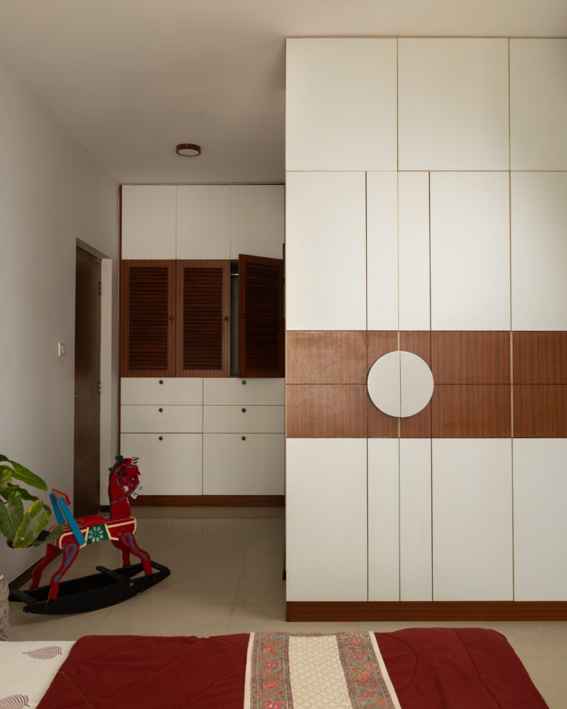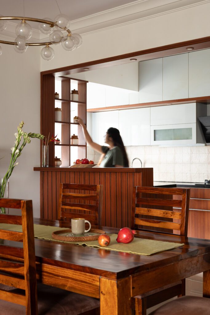 Moving into the dining zone, the dialogue between tradition and contemporary living becomes more pronounced. Minimal wooden furniture is paired with a modern light fixture that defines the space without dominating it, allowing the dining area to function as both a social anchor and a visual pause within the home. This language flows seamlessly into the kitchen, where tonal continuity, efficient planning, and streamlined cabinetry reflect Studio Aelux’s commitment to functional clarity. A distinctive partition featuring pickle jars of varying sizes introduces a tactile, cultural layer, serving as both a spatial divider and a moment of quiet storytelling that connects everyday rituals with design expression.