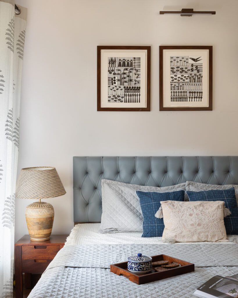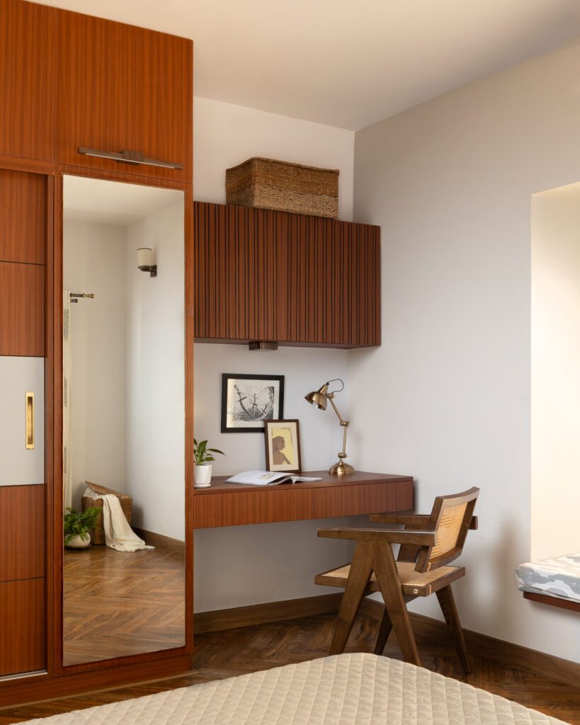 The private quarters are designed as intimate retreats, guided by softness, balance, and understated luxury. In the master bedroom, layered greys and warm lighting create an environment that encourages rest and repose, while wooden veneer wardrobes detailed with subtle grey accents maintain visual harmony. Storage is integrated seamlessly into the architecture, reinforcing the minimalist ethos without compromising practicality. A thoughtfully curated study corner within the bedroom offers a focused workspace, framed by clean geometry and material warmth, an extension of the home’s larger design philosophy where function and atmosphere are treated as inseparable.