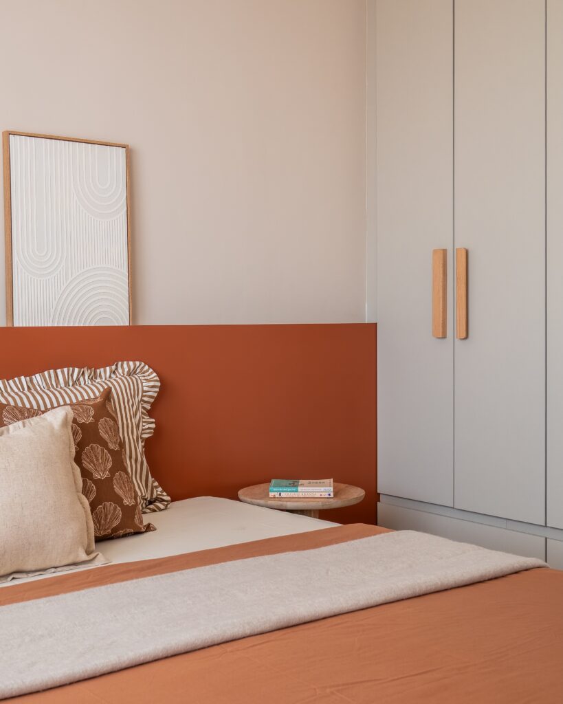 The second bedroom takes a warmer, more grounded direction. A half-height terracotta paint band runs across the wall behind the bed, creating a bold horizontal datum that turns an otherwise simple room into something with genuine spatial intent. Paired white-textured artworks in timber frames are mounted within the cream zone above, their geometric relief pattern maintaining the home’s commitment to surface interest over flat finish. The room is the most quietly joyful in the apartment.