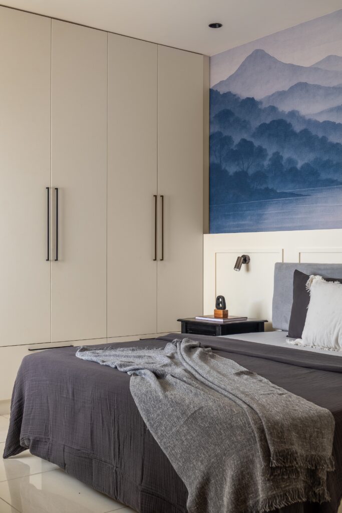 The master bedroom introduces a different design language, quieter and more layered. Above a panelled bedhead wall, a large ink-wash mural in shades of midnight blue depicts a landscape of misty mountains, water, and a pagoda half-consumed by fog. The mural’s East Asian sensibility connects to the wabi-sabi thread that runs through the public spaces, but translates it into something more intimate and still. A fluted black bedside table with brass handles grounds the composition; the contrast between its dark lacquer and the cream wall panelling below the mural is finely judged.