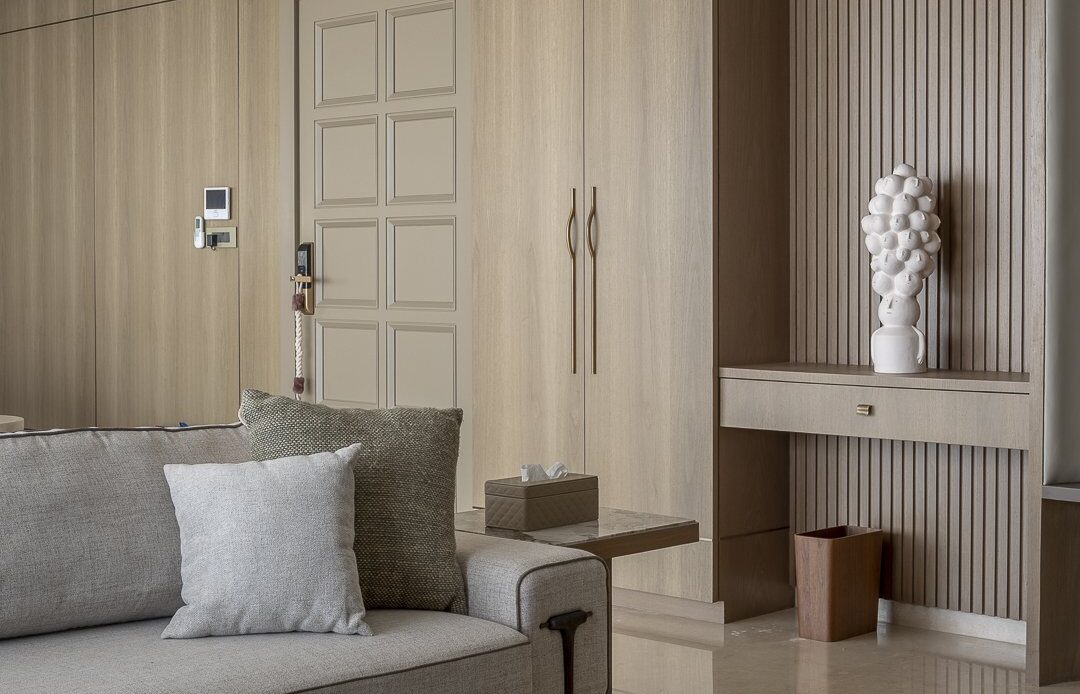 A 2,300-square-foot Worli apartment where muted timber, fluted panelling, and the Arabian Sea compose a home that finds its luxury in restraint.